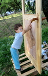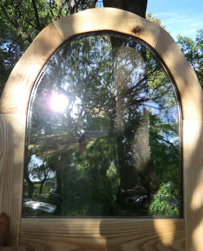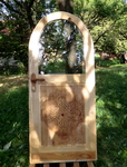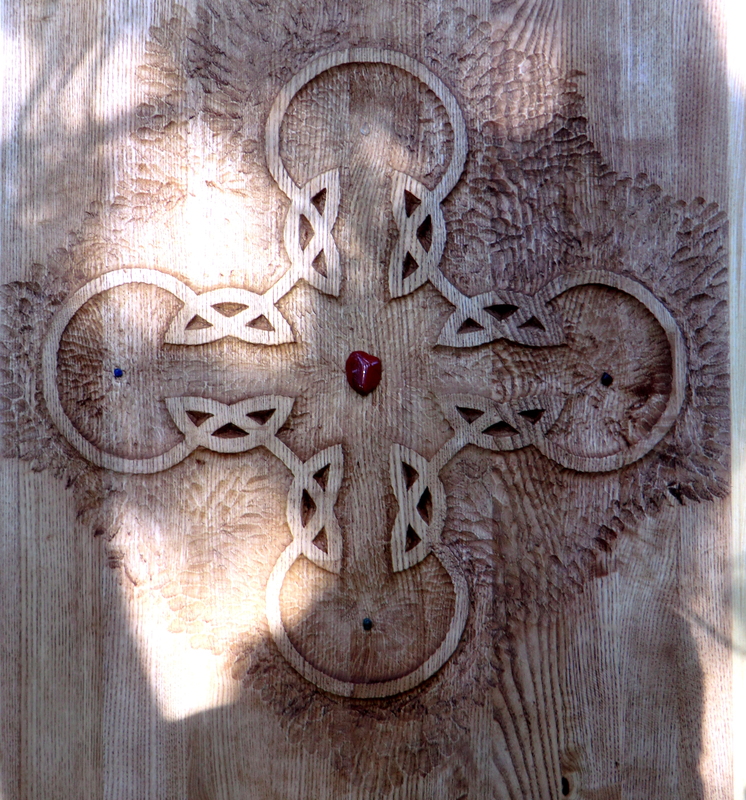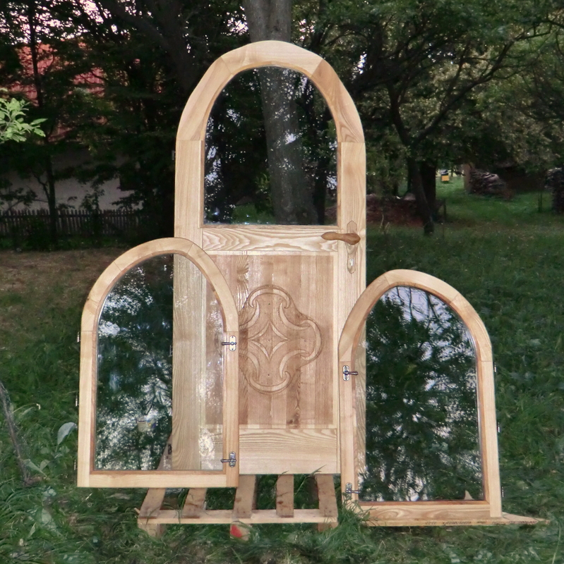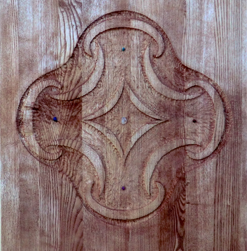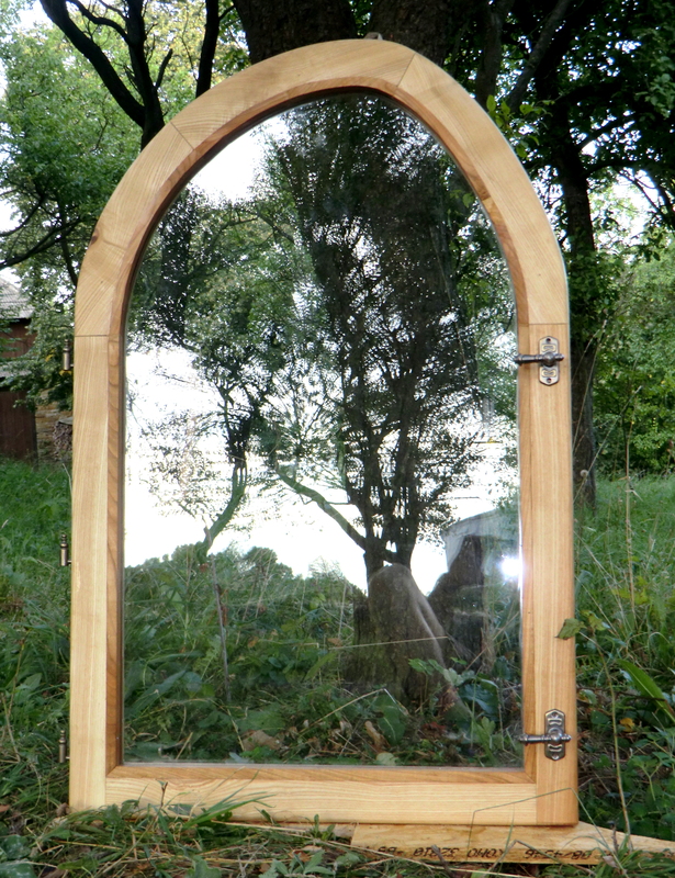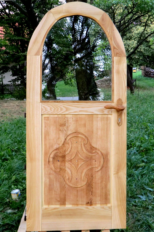 V poslední době jsem se věnoval výrobě dveří a oken pro slaměno-hliněný dům v Bílých Karpatech. Pracoval jsem s jasanovým dřevem. Řezbaná klika, lišty na skla a ochrana nad prahem dveří jsou vyrobeny ze dřeva třešňového. Výplň představuje dvě keltské formy, osazené minerály. Je namořena a zbroušena tak, aby více vynikla řezba. Vše je povrchově upraveno lazurou na dřevo ze směsi přírodních olejů, vnější části pak ochranou proti počasí od rakouské firmy Natural. Dle požadavků mohu vyrobit podobné dveře i okna, nebo jen dřevěné či železné kliky a řezbané reliéfy na zeď.